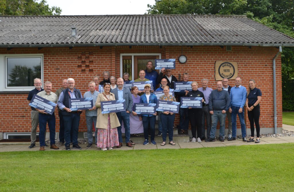 Samlet foto af alle bidrags-modtagerne, som nr. 4 fra venstre, i forreste række, ses Anette fra bestyrelsen med foreningens check på kr. 150.000